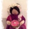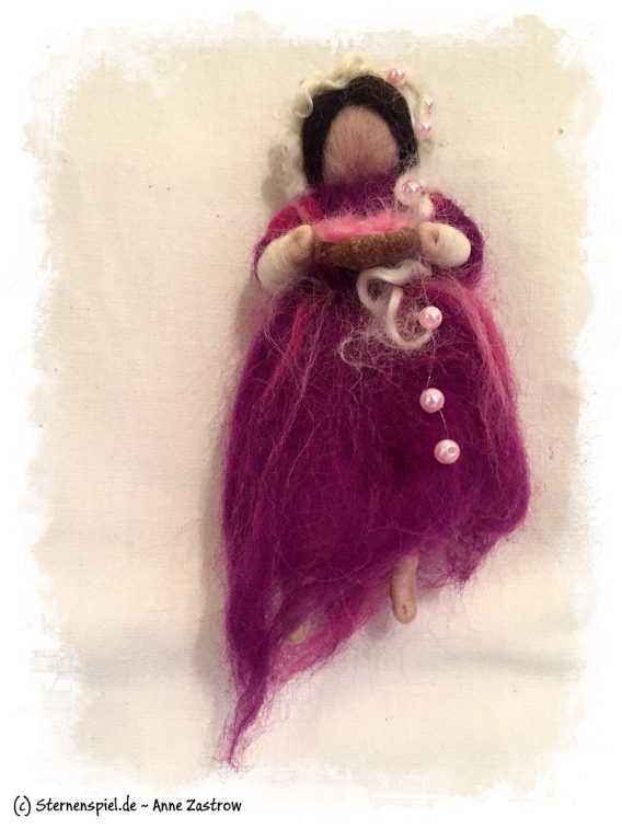 handgefertigt, aus Märchenwolle (100% Schafwolle), Arme biegsam (Draht innenliegend/Pfeifenputzer), trägt eine Schale („Eichelhütchen“) mit Perlen.